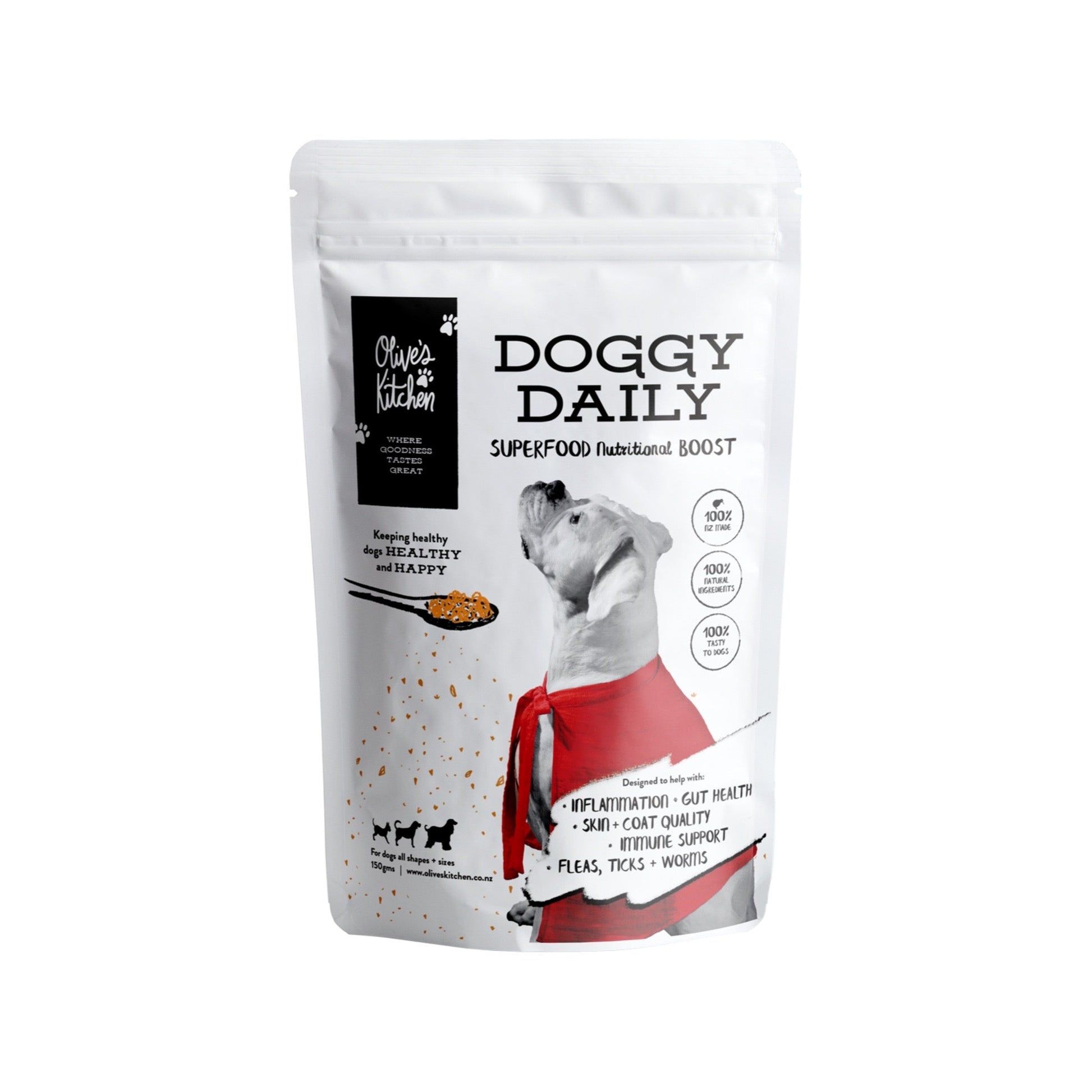 Doggy Daily is a powdered booster made up from a host of 'natural super foods' such as Brazil Nuts (selenium source which aids healthy thyroid gland and immune system), Hemp Seed Powder ( good Omega 3 source to help reduce inflammation and support healthy joints), Turmeric (contains curcumin which supports healthy liver, gut, immune, brain, joint and skin function) and many more. For full list off ingredients click here