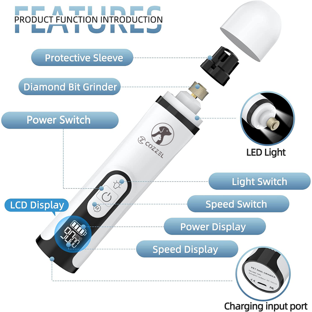 2 LED Lights Design & LCD Power Display: When you gonna grind your fur baby’s nail, the LED bulbs help you see claws clearly and prevent over-grinding or cutting. And you can see the power level on the LCD, so it won't suddenly run out of power when you grind your pet's nails.