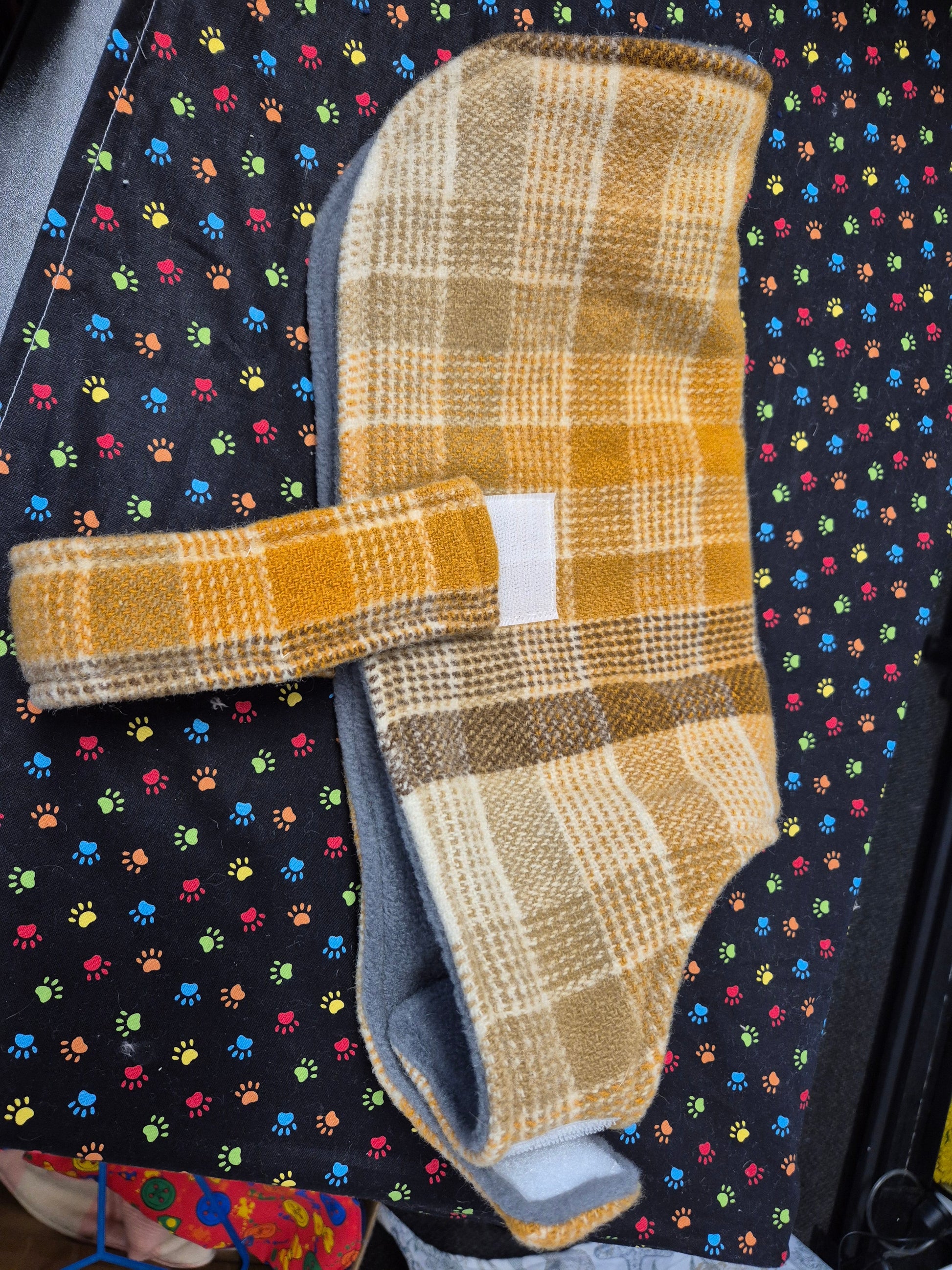Outer is recycled wool blanket, lined with fleece. Pattern placement and lining pattern maybdiffer slightly.