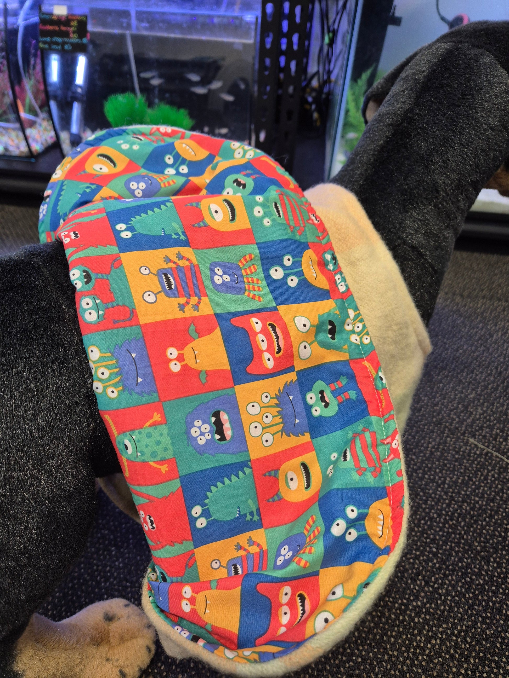 Outer is recycled wool blanket, lined with cute cotton.